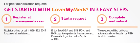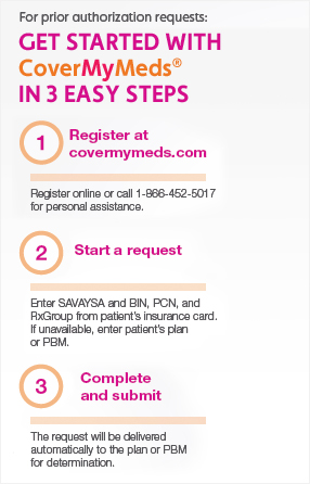 Terms & Conditions: For patients with commercial insurance, or patients without insurance, this savings card is applied after the following out-of-pocket expenses are met: $4 for a 30-day prescription or $12 for a 90-day prescription. This card is not insurance and does not cover deductibles. The maximum benefit is $350 per 30-day prescription or $1,050 per 90-day prescription. For patients with commercial insurance, card activation must occur by 12/31/16 and program expiration is 12/31/17. For patients without insurance, card activation must occur by 12/31/15 and program expiration is 12/31/16. This offer is not conditioned on any past, present, or future purchases, including refills. Patients, pharmacists, and prescribers cannot seek reimbursement from health insurance or any third party for any part of the benefit received by patients through this offer. Patient acceptance (use) of this offer constitutes an acknowledgement that it is not prohibited by the patient's insurance, and that patient will report the value received if required by the insurance provider. This offer is non-transferable and no substitutions are permissible. Offer cannot be combined with any other rebate/coupon, free trial, or similar offer for the specified prescription. Reproductions of the card are void. If your pharmacy does not accept the SAVAYSA Savings Card, visit www.patientrebateonline.com for instructions on how to obtain the savings benefit or call the number below. This is not insurance.